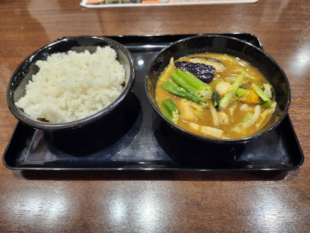 今回は、野菜たっぷりでヘルシーな「かぼちゃと冬野菜スープカレー ライス付き」を注文してみました。