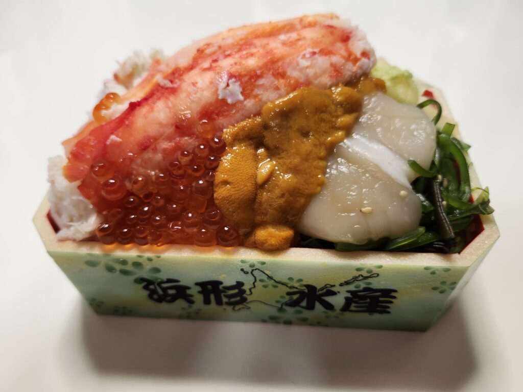 浜形水産の海鮮弁当は、どの弁当も具材がてんこ盛りの弁当になっていて、今回は「特大たらば浜形」という海鮮弁当を買ってみました。