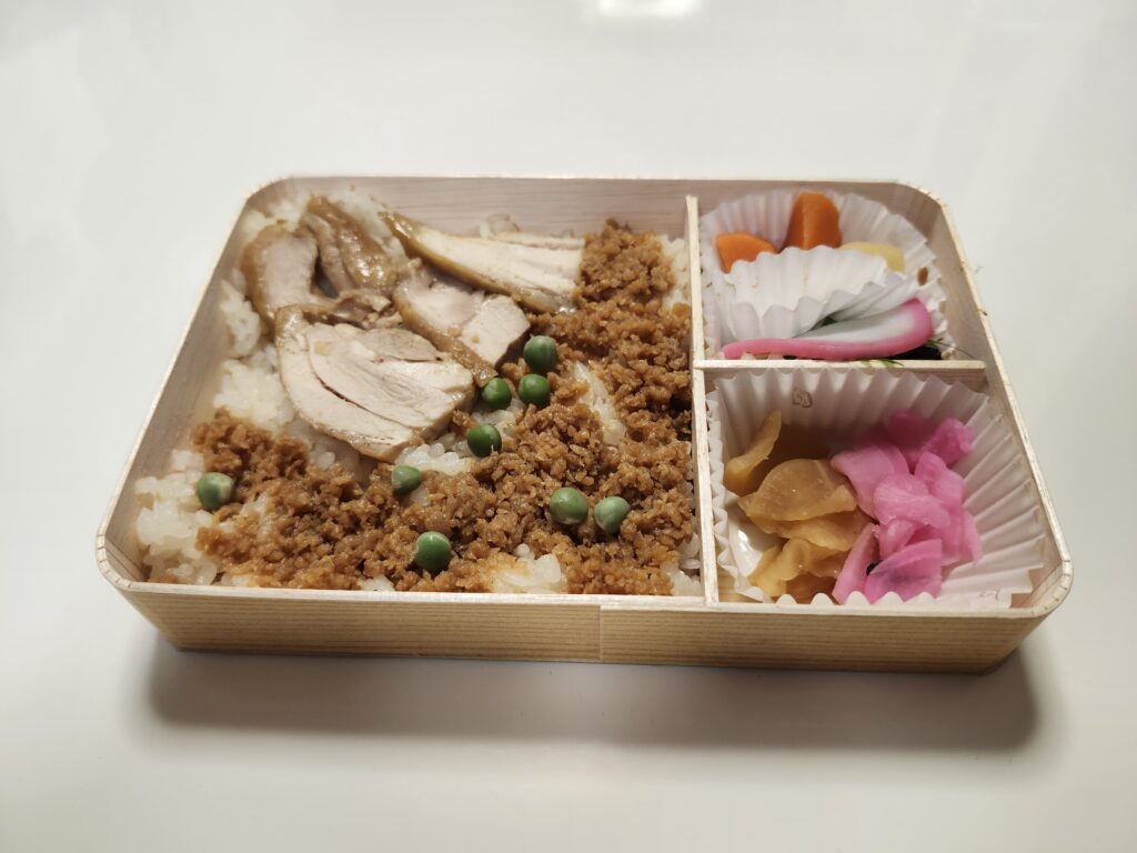 小牛田とりめしは、鶏そぼろご飯がメインで鶏そぼろご飯に鶏肉をのせて、漬物などの付け合わせが付いている弁当になります。
